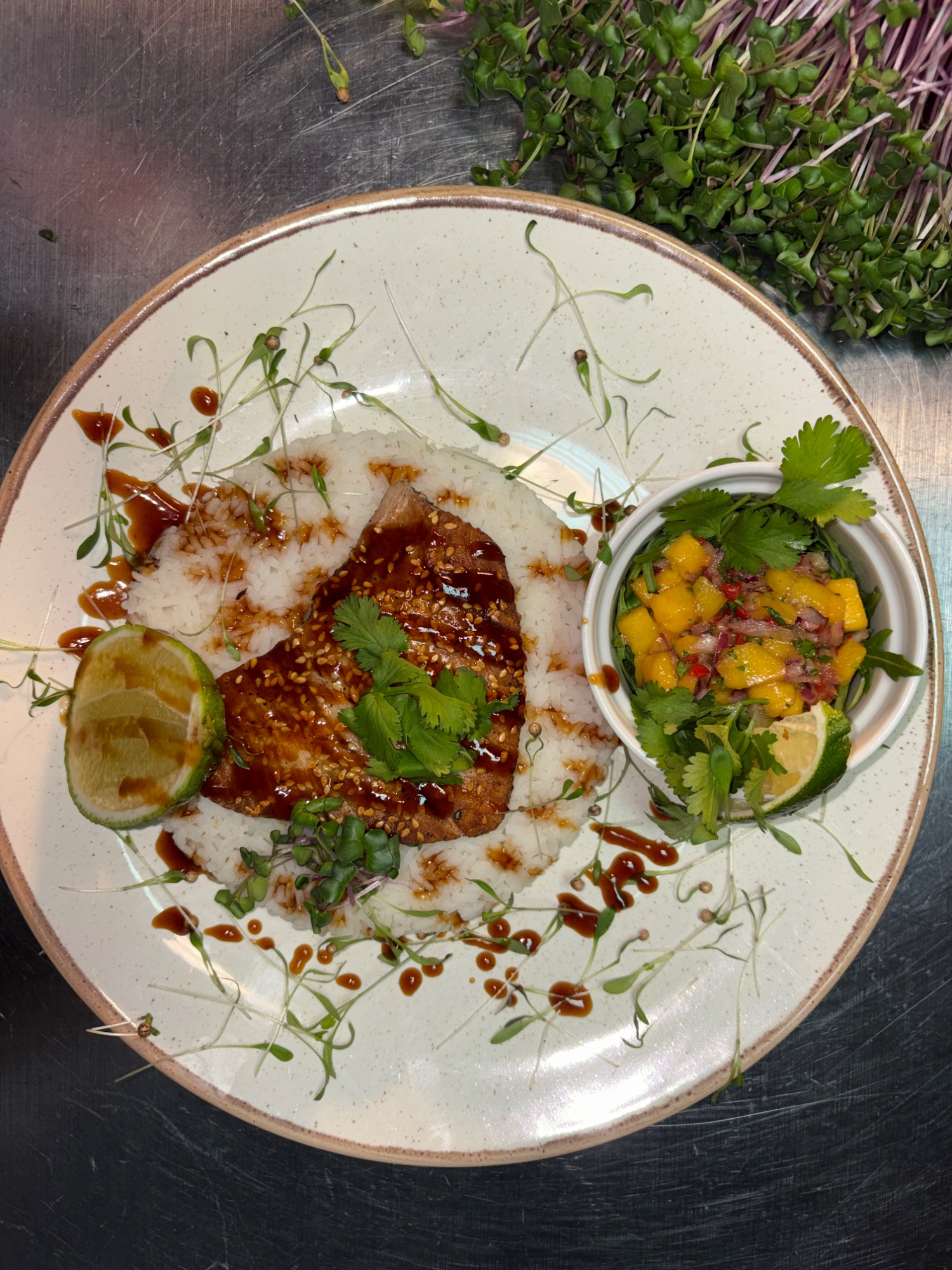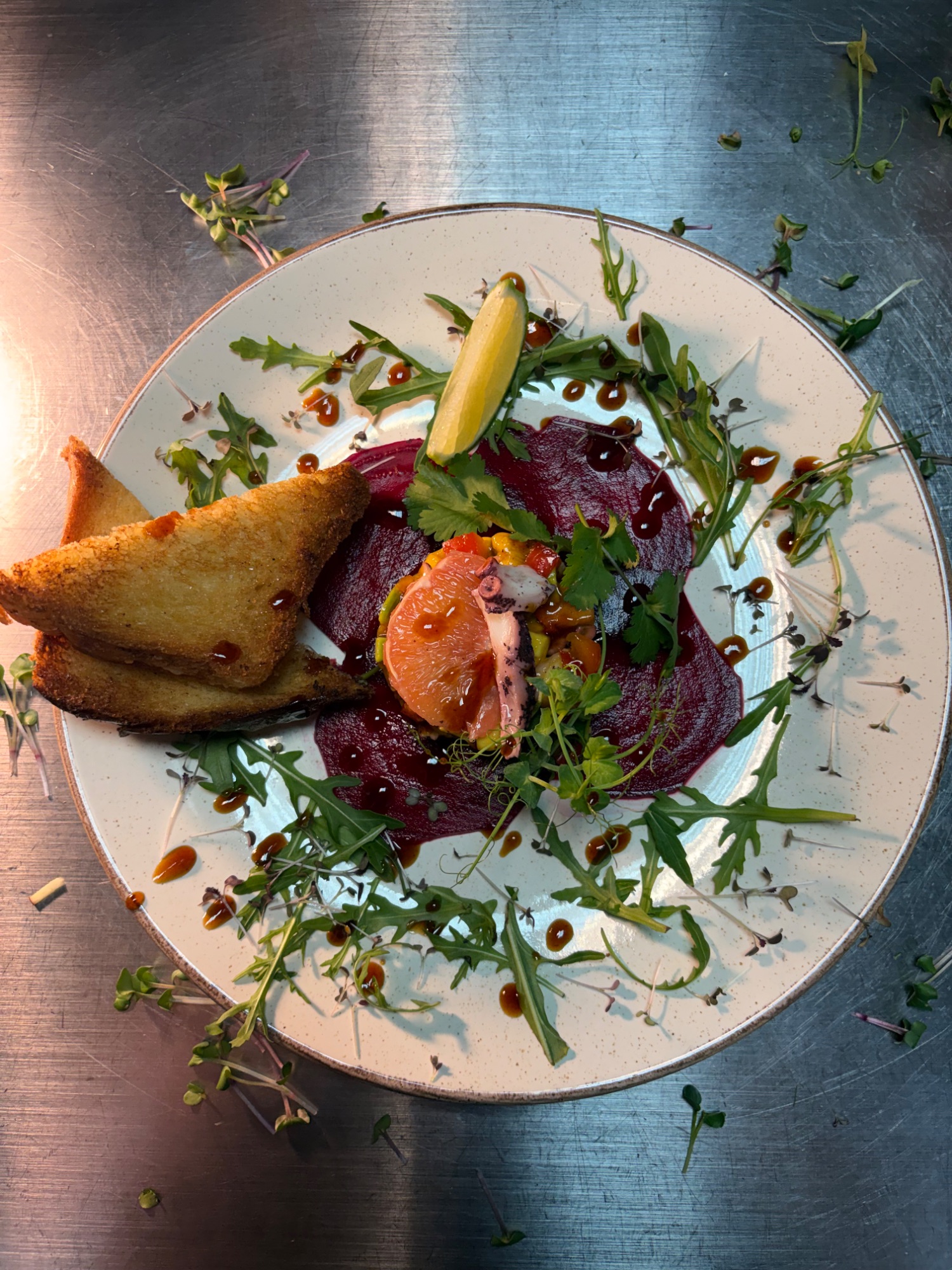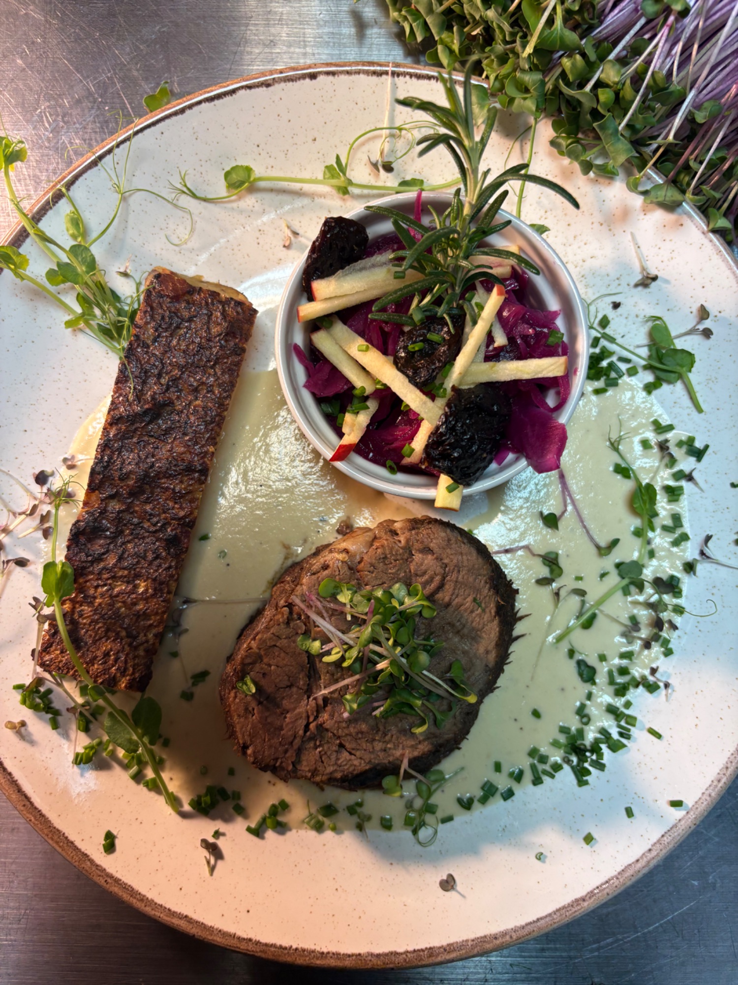 (270g) | gratin ziemniaczane | cebula | pomidorki na gałązce | pieczarki | sos demi glace | sos pieprzowy